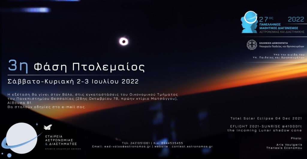 Το Σάββατο-Κυριακή 2-3 Ιουλίου 2022 θα πραγματοποιηθεί η 3η φάση του Πανελλήνιου Διαγωνισμού Αστρονομίας στο Τμήμα Οικονομικών Επιστημών στον Βόλο.