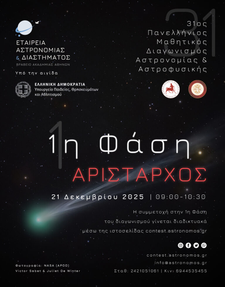 ΑΝΑΚΟΙΝΩΣΕΙΣ 31ος Πανελληνίος Μαθητικός Διαγωνισμός Αστρονομίας & Αστροφυσικής 2026 Διαβάστε περισσότερα Ιωάννης Ζαχείλας 27 Νοεμβρίου, 2025