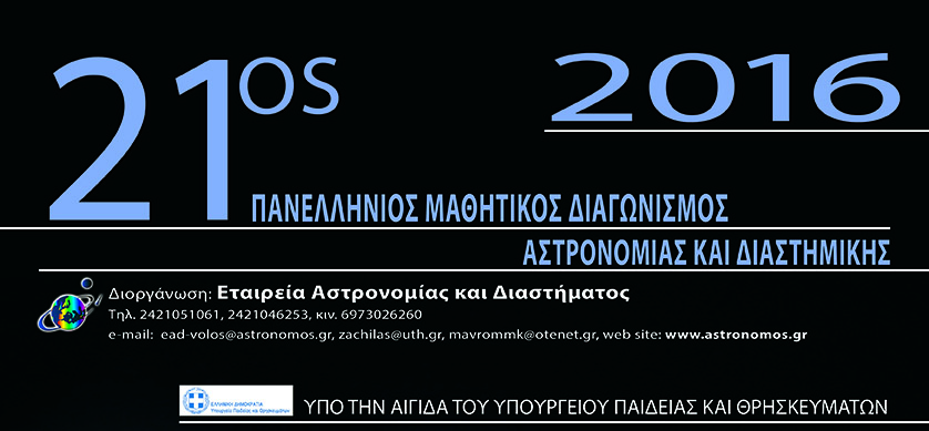 ΠΑΝΕΛΛΗΝΙΟΣ ΜΑΘΗΤΙΚΟΣ ΔΙΑΓΩΝΙΣΜΟΣ ΑΣΤΡΟΝΟΜΙΑΣ 21ος Πανελλήνιος Μαθητικός Διαγωνισμός Αστρονομίας & Διαστημικής 2016 Διαβάστε περισσότερα astronomos 5 Οκτωβρίου, 2015