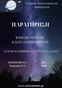 Παρά την επιτυχία της ταινίας «Don’t Look Up» εμείς θα θέλαμε να σας ενθαρρύνουμε στο «Να Κοιτάτε Ψηλά» και γι’ αυτόν τον λόγο, σας ενημερώνουμε για την συνέχιση των άρθρων με τον τίτλο «ΔΕΙΤΕ ΣΤΟΝ ΟΥΡΑΝΟ», μέσα από το ανανεωμένο μας site https://astronomos.gr/, της Εταιρείας Αστρονομίας και Διαστήματος, με έδρα τον Βόλο!