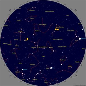 Επομένως, από τους πέντε πιο εύκολα ορατούς πλανήτες, αυτήν τη εποχή μπορούμε να διακρίνουμε και τους πέντε, ξεκινώντας πρώτα από τον Ερμή και όσο ακόμη ο ουρανός είναι φωτεινός, ακολουθεί η Αφροδίτη, που συνεχίζει να εμφανίζεται ως Αποσπερίτης. Συνεχίζουμε, μετά τις 22.00, με τον πατέρα της θεάς Αφροδίτης, τον γιγάντιο Δία, αλλά και τον παππού της τον Κρόνο ,ο οποίος αυτό το καλοκαίρι θα μας κάνει την χάρη με την κλίση που θα έχει, να τον παρατηρήσουμε και να μαγευτούμε από τους δακτυλίους του. Συνεχίζουμε την περιπλάνηση μας στα άστρα της «Λύρας» του μυθικού μουσικού Ορφέα και συνεχίζουμε με τον πολεμοχαρή Άρη, ο οποίος στέκει φωτεινός στο νυχτερινό ουρανό.