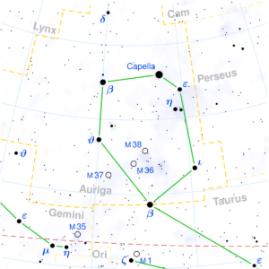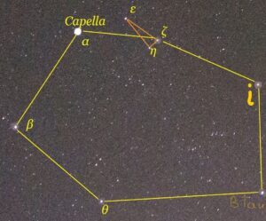 Η Αίγα είναι ο έκτος πιο λαμπρός αστέρας του ουρανού. Η Αίγα,ή Capella στα λατινικά , είναι ένας γίγαντας αστέρας, ίδιου φασματικού τύπου με τον Ήλιο μας. Πρόκειται για διπλό αστέρι, σε απόσταση 45 ετών φωτός (ε.φ.) περίπου. Ακριβώς κάτω και δεξιά της Αίγας βρίσκονται τρείς αμυδροί αστέρες που ονομάζονται Ερίφια (ε AUR, ζ AUR, η AUR) και σχηματίζουν ισοσκελές τρίγωνο στον ουρανό.