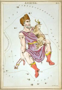 Ο Ηνίοχος παριστάνεται ως ο φύλακας των βοσκών και φέρει την Αίγα πάνω στον ώμο του καθώς καλπάζει με το άρμα του στον ουρανό. Είναι ένα καλό σημάδι για τους βοσκούς, ότι σύντομα θα αρχίσει η περίοδος των βροχών, πρασινίζουν τα λιβάδια, για να θρέψουν τα κοπάδια τους.