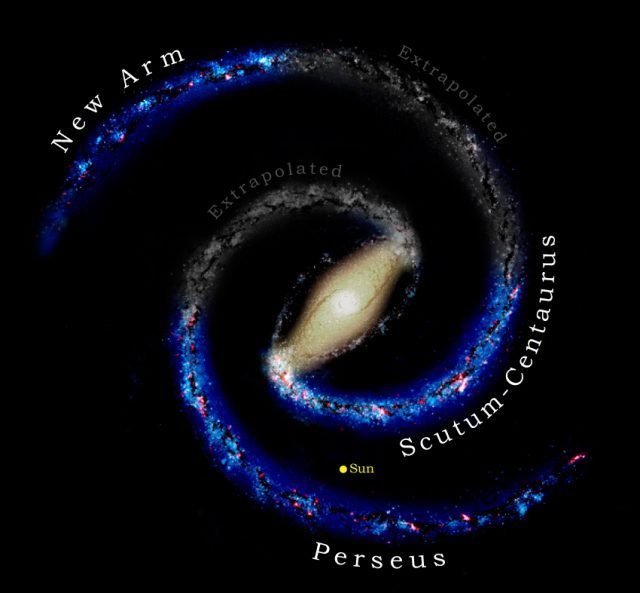 Οι επιστήμονες εκτιμούν ότι η νέα σπείρα είναι προέκταση του βραχίονα Ασπίδας-Κενταύρου, έναν από τους δύο κύριους σπειροειδείς βραχίονες του γαλαξία μας (βλέπε σχήμα). Εάν η πρότασή τους επιβεβαιωθεί, θα αποδειχθεί ότι ο Γαλαξίας μας έχει μια εντυπωσιακή συμμετρία, με το νέο βραχίονα να είναι συμμετρικός του βραχίονα του Περσέα.