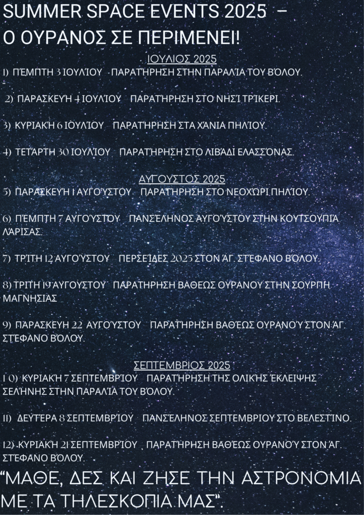 “Η Εταιρεία Αστρονομίας και Διαστήματος (ΕΑΔ), με έδρα τον Βόλο, σας προσκαλεί σε 12 (δώδεκα) μοναδικές Αστροβραδιές!