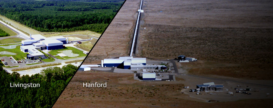 Εικόνα 1: Το παρατήριο βαρυτικών κυμάτων LIGO με τους δυο δίδυμους ανιχνευτές στο Livingston, Louisianaκαι Hanford, Washington State στις Ηνωμένες Πολιτείες. Η εικόνα είναι απο τοLIGOLaboratory/Caltech/MIT